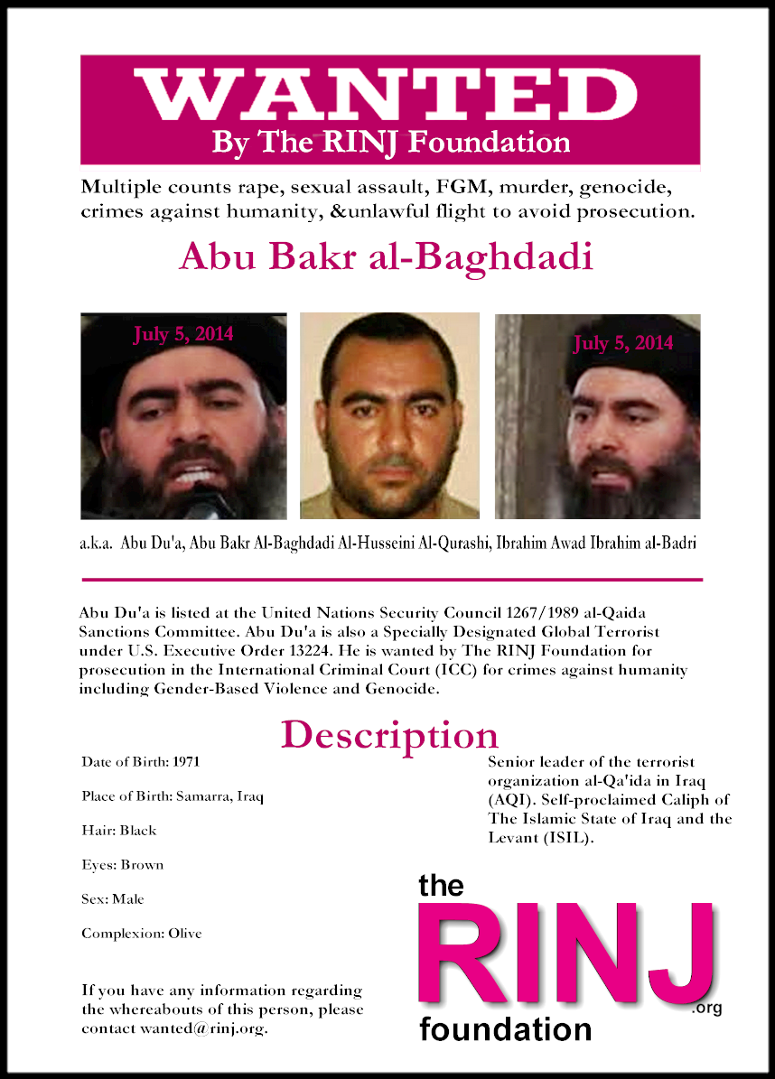 Abu Bakr al-Baghdadi is actually Abu Du'a who is listed at the United Nations Security Council 1267/1989 al-Qaeda Sanctions Committee. Abu Du'a is also a Specially Designated Global Terrorist under U.S. Executive Order 13224. He is wanted by The RINJ Foundation for prosecution in the International Criminal Court (ICC) for crimes against humanity including Gender-Based Violence and Genocide.But The Typical Misogynyst is a "Shallow Nobody"
